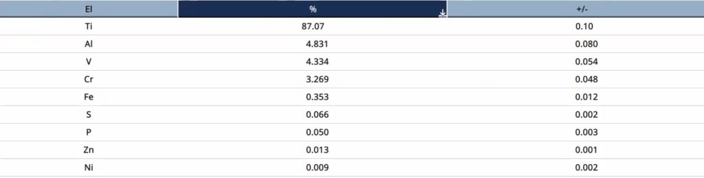 This claim may be somewhat misleading, as X-ray fluorescence (XRF) analysis shows that while the alloy is based on T6Al4V (one of several “aerospace-grade” titanium alloys), the use of ferrochrome means it is not the alloy typically used in aerospace applications. The use of chromium makes the alloy brittle at high temperatures, and the iron content reduces its corrosion resistance—both undesirable characteristics in aerospace applications.